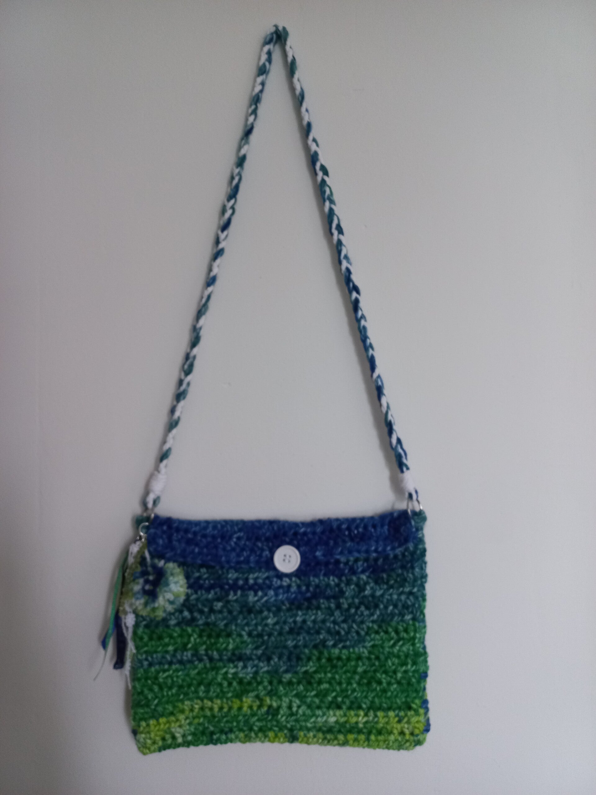 Gehaakte tas waar er maar één van is. De magische blauw en groen tinten maken van deze tas een echte eye catcher.