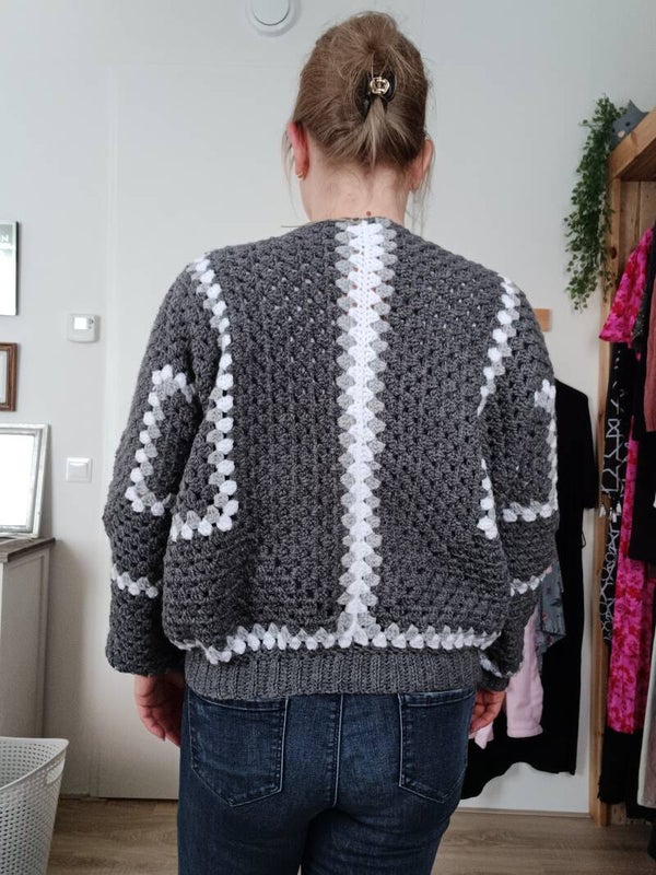Gehaakte hexagon trui in de kleuren grijs en wit met leuke buidel aan de voorkant.