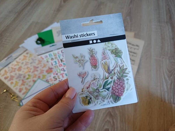 Inhoud: 1 DIY basis journal pakket (groene cover), 6 pagina's met diverse opdruk (dieren, notenmuziek, boek pagina), 4 notitiekaartjes, 1 alfabet stickervel, 1 vlinder stickervel, bloemenstickers, 2 washitapes, diverse paperclips, splitpennen.